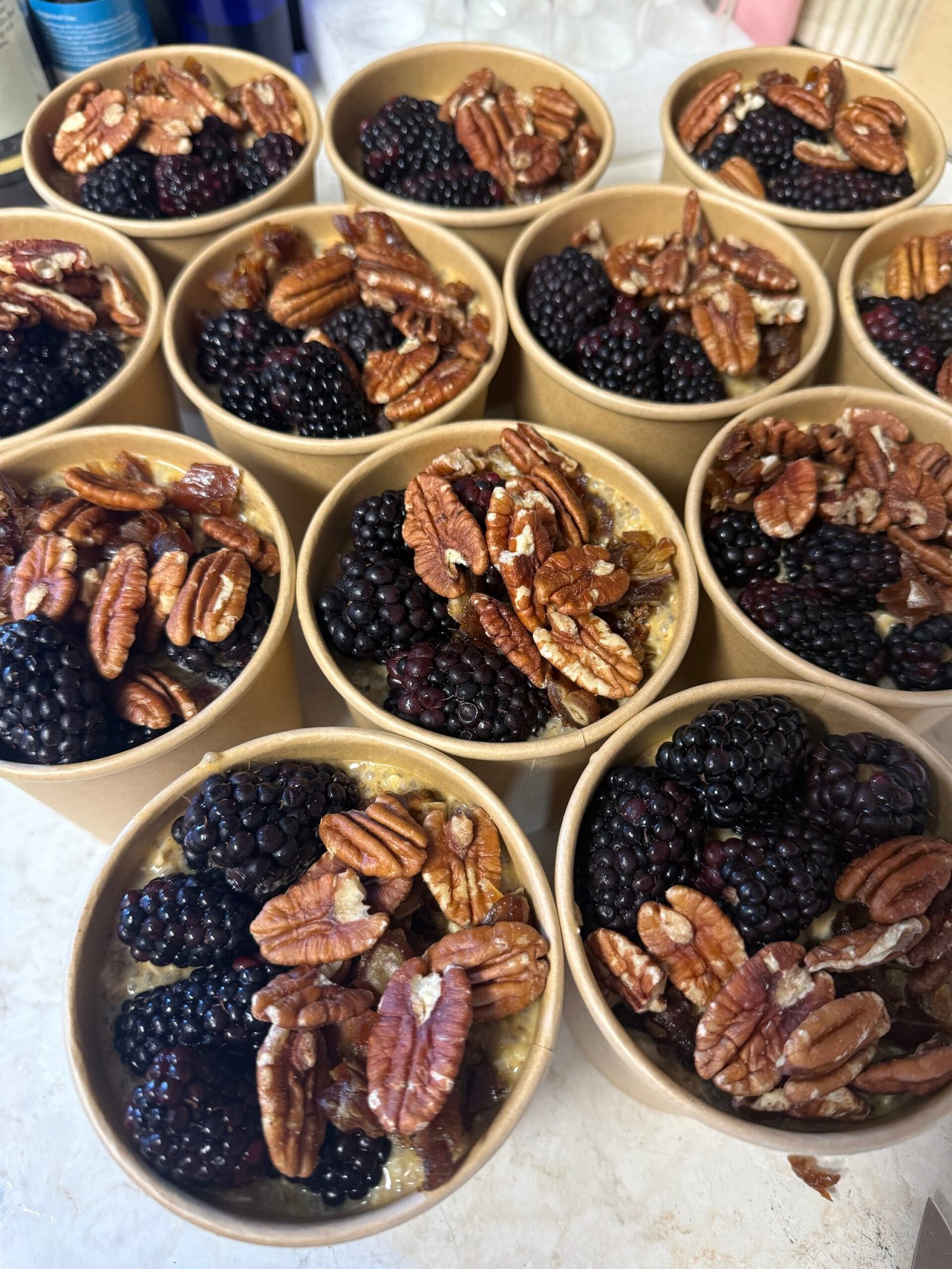 8oz Made with organic, glyphosate, free, gluten-free, oats, Chia seeds, hemp seeds, flaxseeds, coconut yogurt, almond milk, almond butter, cardamom, clove, ginger, pumpkin purée, raspberries, blackberries, pecans, chopped dates