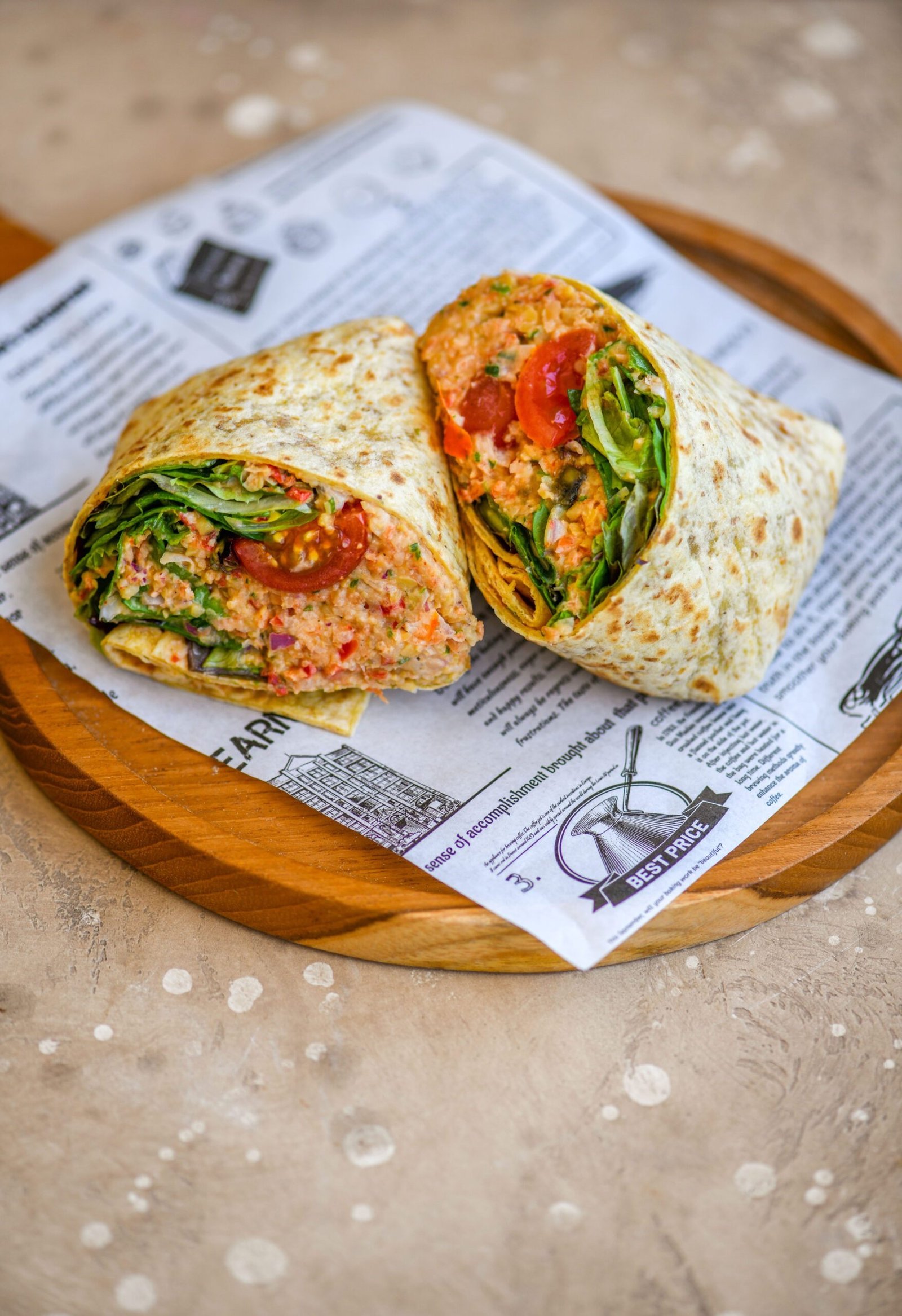 A vibrant mix of chickpeas tossed in creamy plant-based mayonnaise with fresh dill, crisp celery, onions, and red peppers. Served on a bed of kale and spring mix, all wrapped in a soft spinach flour tortilla for the perfect balance of crunch and comfort.