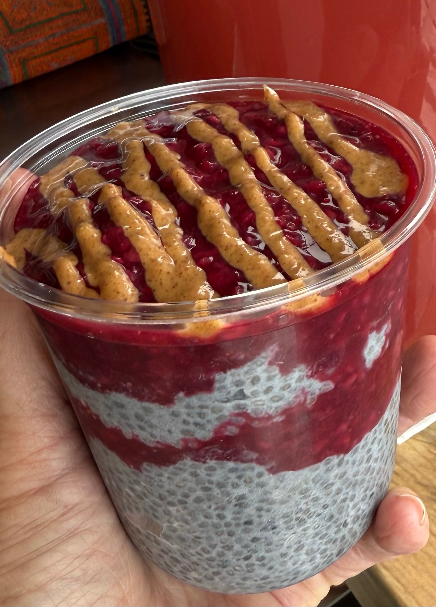 Made with organic Chia seeds, almond milk, coconut, milk, raspberries, blackberries, strawberries, blueberries, and almond butter