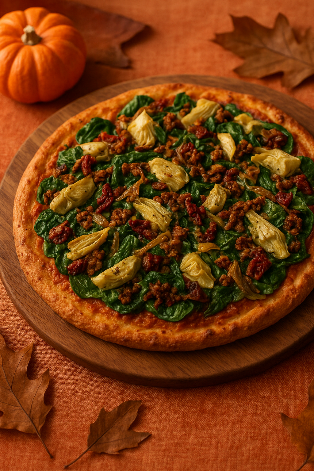 10 inch cauliflower crust, this cozy autumn inspired pizza starts with a creamy butternut squash sauce and is topped with spinach, marinated artichokes, caramelized onions, sun dried tomatoes, plant based cheese and savory lentil walnut crumbles. A nourishing blend of sweet, savory, and earthy flavors that delivers true comfort in every bite.